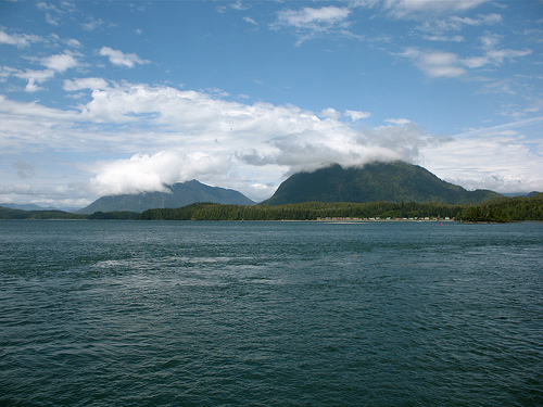 Catface (left) and Lone Cone, Clayoquot Sound. Village of Opitsaht in the foreground, Tofino to the right. Source: flickr.