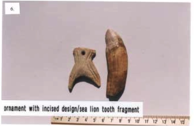 Decorated antler?, and a worked sea lion tooth from the Elchuk collection, Mill Hill.