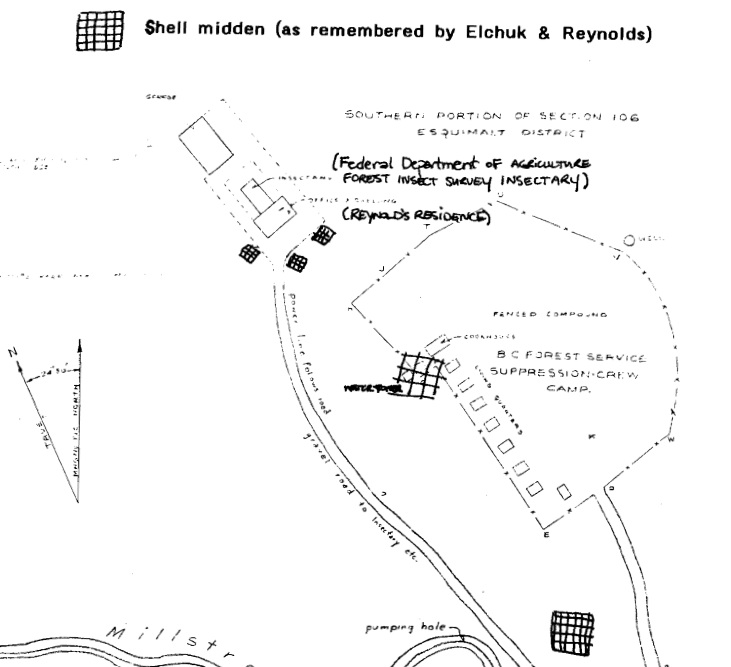 The first is the documentation of an unrecorded shell midden at Mill Hill, not DcRu-70 but another site, including a sketch map of the location which is about 2 to 3 kilometres inland.  There are also reports of unrecorded inland shell middens at Thetis Lake Park. Since such sites are rare and poorly know,  then this is something worth following up.  Indeed, I wish the CRD took their stewardship role seriously enough to commission an intensive, comprehensive, and professional inventory of the archaeological heritage of all their Parks.  This kind of baseline information is so essential that I honestly don’t understand how they think they can discharge their duties without it.