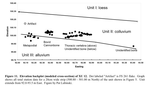 Well, probably.  But the fact is, three chert flakes have been found in the dig, two of which are fairly conclusive looking, and one of which has pretty good provenience.  The preliminary report authors (Lubinski et al 2009; download PDF) are admirably restrained about the associations and even the artifactuality of these flakes, and more power to them for that.  Nonetheless, the picture above shows a pretty plausible chert flake (see also: Current Research in the Pleistocene, 2009; PDF).  Vertically, this flake was found 15 cm above the mammoth bones.  However, we know that stratigraphy does not always lie horizontally, and when the backplot is considered (below) then we see a much more likely association between the mammoth, a probable Bison antiquus,  and the flake. A luminescence date on Unit II sediments came back at 14,000 +/- 1,000 years ago. As you can see, the overlying unit is loess, likely the result of terminal Pleistocene deglaciation processes. The luminescence dates and radiocarbon dates (five altogether) are in stratigraphic order and the geoarchaeology seems right, and tight.