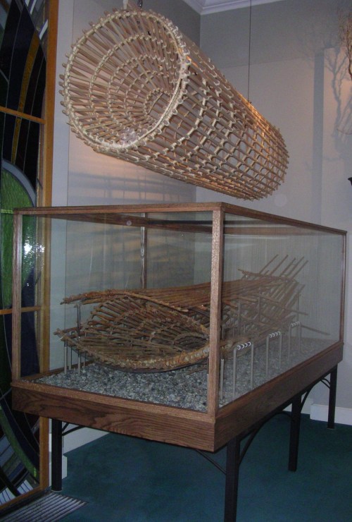 Montana Creek fishtrap on display, after conservation. Trap shape has not been fully restored to cylindrical original. Source: Sealaska.
