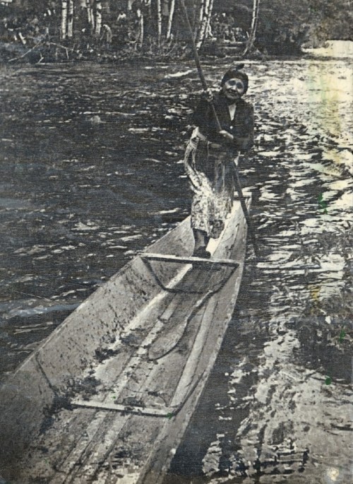 Stillaguamish elder Martha Tommy poles a river canoe in an undated historic photo. Note the widest point of the canoe is near the bow. Source: Stillaguamish.com