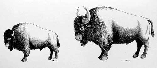 Bison antiquus (right) compared in size to modern Bison (Bison bison). Source: texasbeyondhistory.net