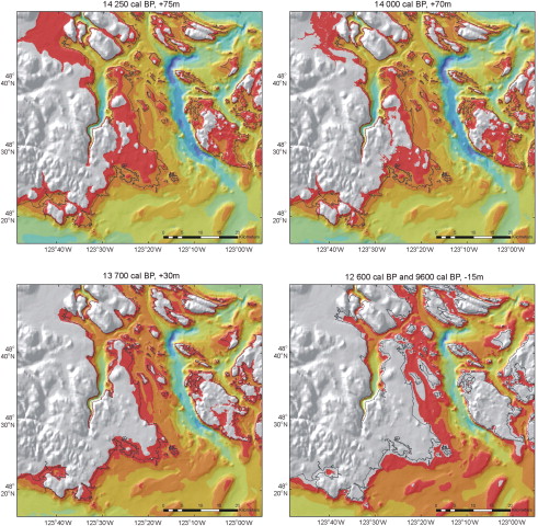 So it is a remarkable find and a careful analysis which seems to me to be quite conclusive, despite the unusual recovery process. Humans were therefore in the Salish Sea by 14,000 years ago and the fact we have not yet found abundant evidence of this is probably mostly due to having looked in the wrong places: a failure of imagination to think of our familiar region at times of different sea levels (see below), as a tundra, as a grassland teeming with giant bison.