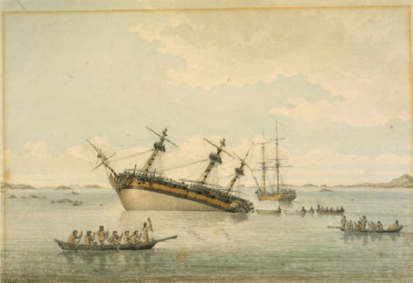 The Discovery on the Rocks, Queen Charlotte Sound. The Chatham stands off in the distance. Watercolour by William Alexander; sketch by Zachary Mudge. Source: University of Illinois.