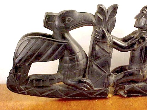 I now feel i know just enough to be dangerous.Actually,its a fun hunt for knowledge. Theres aan on one end on hid knees (i think)his hands are straight out in front of him palms up. He has an animal skin hes wearing with the animals head resting on his head,these appear to be in the mouth of a scary bird only showing only the top of his beak.The other end is a head(mans)on top of an animals head whos mouth is wide open(scary to)now the very top face sitting on monsters head is the back of a man facing forward hands stretchef forward holdig the sides and this figure has an animal head of some sort instead of human and he appears to be sittingin front of him in yhe middle of the piece a copper pipe going straight up 2 inchs.on the rest im not sure what im seeing.ill try to send some pics and maybe youd be kind enough to help with any knowledge youight have.Ill try to send some pics.If nothing comes of it id like to thank you for the help youve already given me.mike h