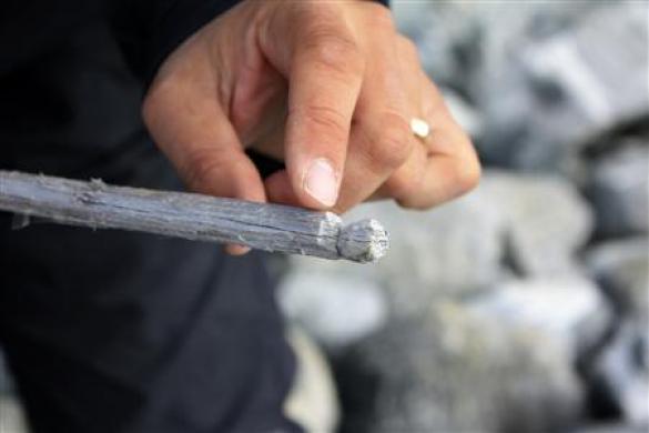 There are also a number of “scare sticks” like the one above, inferred to have been part of reindeer driving lanes. A separate piece of smaller wood would be attached to the top where there is a notch, and this would apparently flap in the breeze. When arranged in lines, these sticks would create a visual illusion of a line of humans waving/threatening the reindeer. This is an interesting kind of technology which I don’t recall being recovered from the North American ice patches although drive lanes were of course widely used. As with the North American patches, there are also numerous projectiles, some still bearing their feather fletching and copious quantities of dung, which tells its own long-winded story. In the video, the scientists have dug a deep ice cave into one of the patches, for some reason that is not made clear, and they have mounted replicas into the icy walls of this cavern – it is not clear from the narration that these are, indeed, not real artifacts in their primary context so don’t faint when you see them!