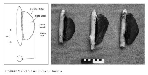 Experimental reproductions of Fraser River ground slate knives, similar to an archaeological specimen found waterlogged - see Bernick 1994 in The Midden. Source: Morin 2004, Canadian Journal of Archaeology.