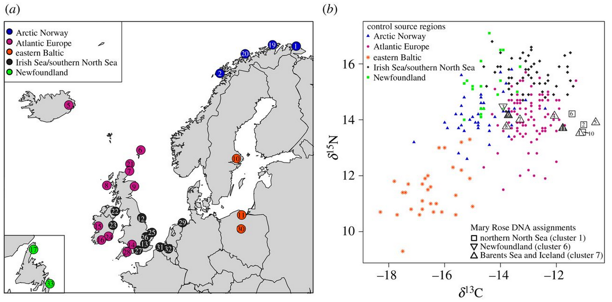 Scatterplot of stable istope composition of the comparative sample and the Mary Rose sample. Source: Hutchinson et al. 2015.