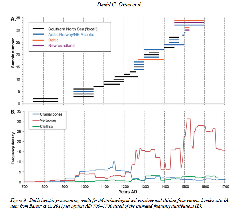 Origin of medieval London cod bones and body part composition, suggesting increased reliance on stored/salted cod from greater distances through time. Source: Orton et al. 2015.