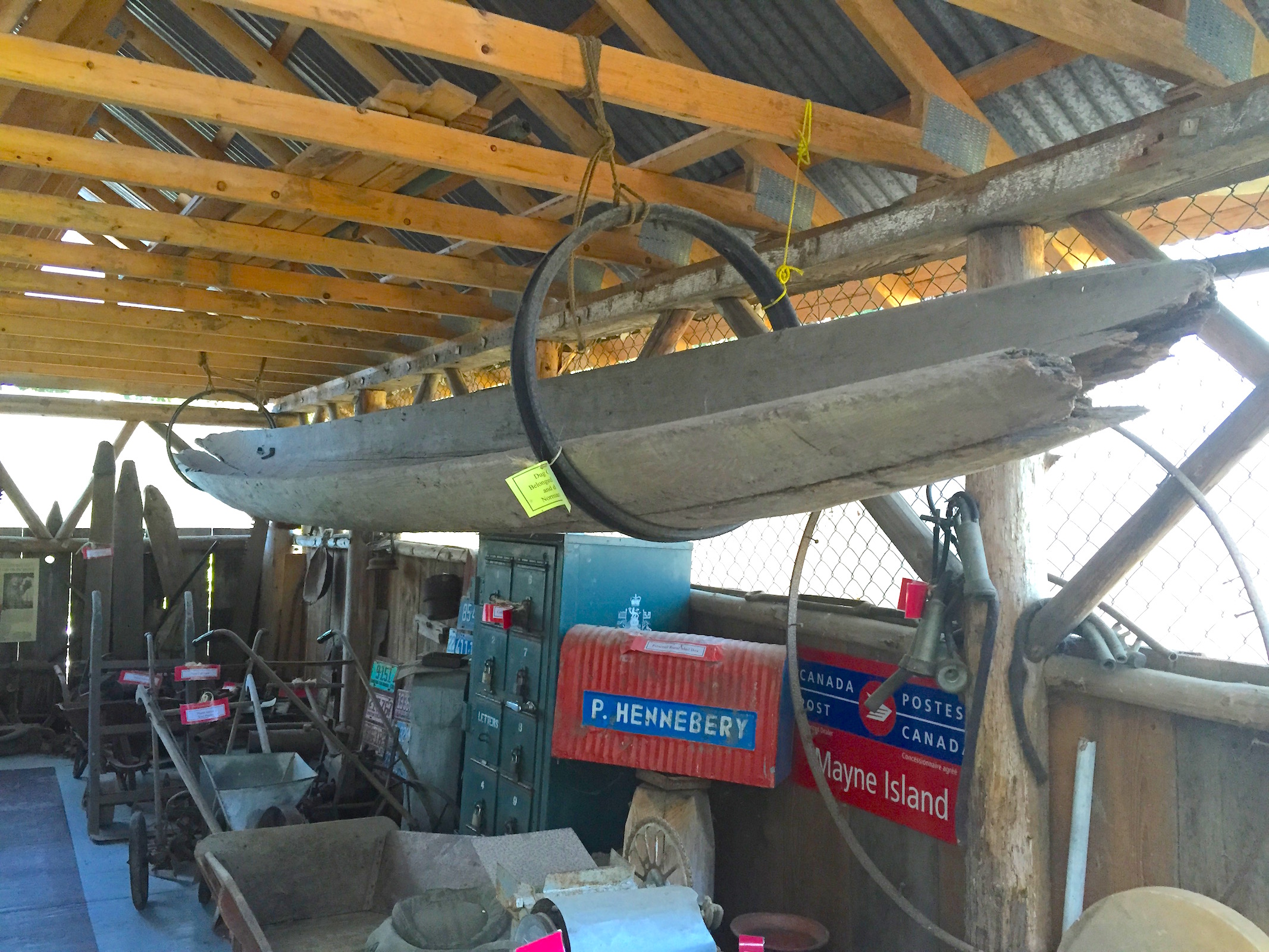 Dugout Canoe in Mayne Island Museum. Caption reads: “Belonged to Felix Jack and donated by Norman Georgeson”