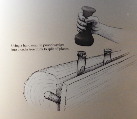 Again apologies for the potato-quality pictures from my phone. There’s a stone bowl to the right, and some spherical stones to the rear which, unless convinced otherwise, I’m going to suggest are natural, possibly concretions. There’s a variety of handmauls in the vase, apparently from both Marpole (nipple-top) and Strait of Georgia (flat top) time periods. These artifacts, all of which here are broken, were probably mainly used as a hand-hammer to drive chisels and wedges in the advanced and essential woodworking tradition of the coast. One of them, appropriately near the rear, is of the fairly and irresistible phallic genre. [editor: google your own]. Another has concentric rings. Here’s an image of more, from the Hilary Stewart obituary post. Below is an illustration of the use of a handmaul, bizarrely from the DailyKos site which I thought was just political blow-harding, but the page in question has a lot of pictures of NW Coast woodworking tools.