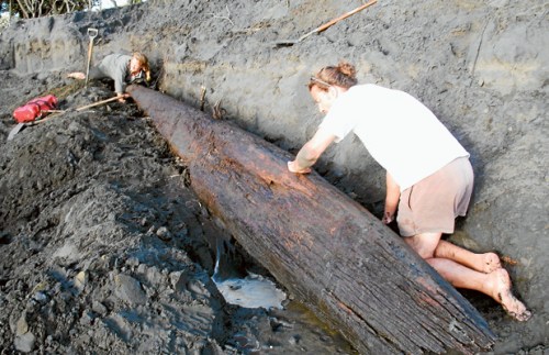 The above is maybe the most unusual object I saw in the archaeological cases in my visit to the Mayne Island museum. As you can see, it’s labelled as a “large stone abrader” and may well be, I suppose. It’s thin, an the reddish cast and sort of laminate structure of the rock makes me think it is schist, a material commonly used for flaked “slate” as well as for saws. If it’s an abrader, I’d say it’d be a saw, since no sign (on this face) of any smooth abraded areas. However, the general shape seems pretty elaborate for any abrader or saw from my experience. Maybe an elaborate ulu-style knife intended to be hafted across the neck. Or, what I was wondering when I was there, maybe triggered by a false association to the shape, was something like the ground slate mirrors from the North Coast. These would be polished to a sheen, then wetted, thus providing a reflection, and if memory serves (and it often doesn’t) were used in rituals more than for popping blackheads. But it doesn’t seem polished enough for that. All the same, the shape rings a bell and rather than spend too much time looking through old Syesis’s (Syeses? Syesisis?? ‘copies of the journal Syesis’ – phew) I’m throwing it out here for comment.