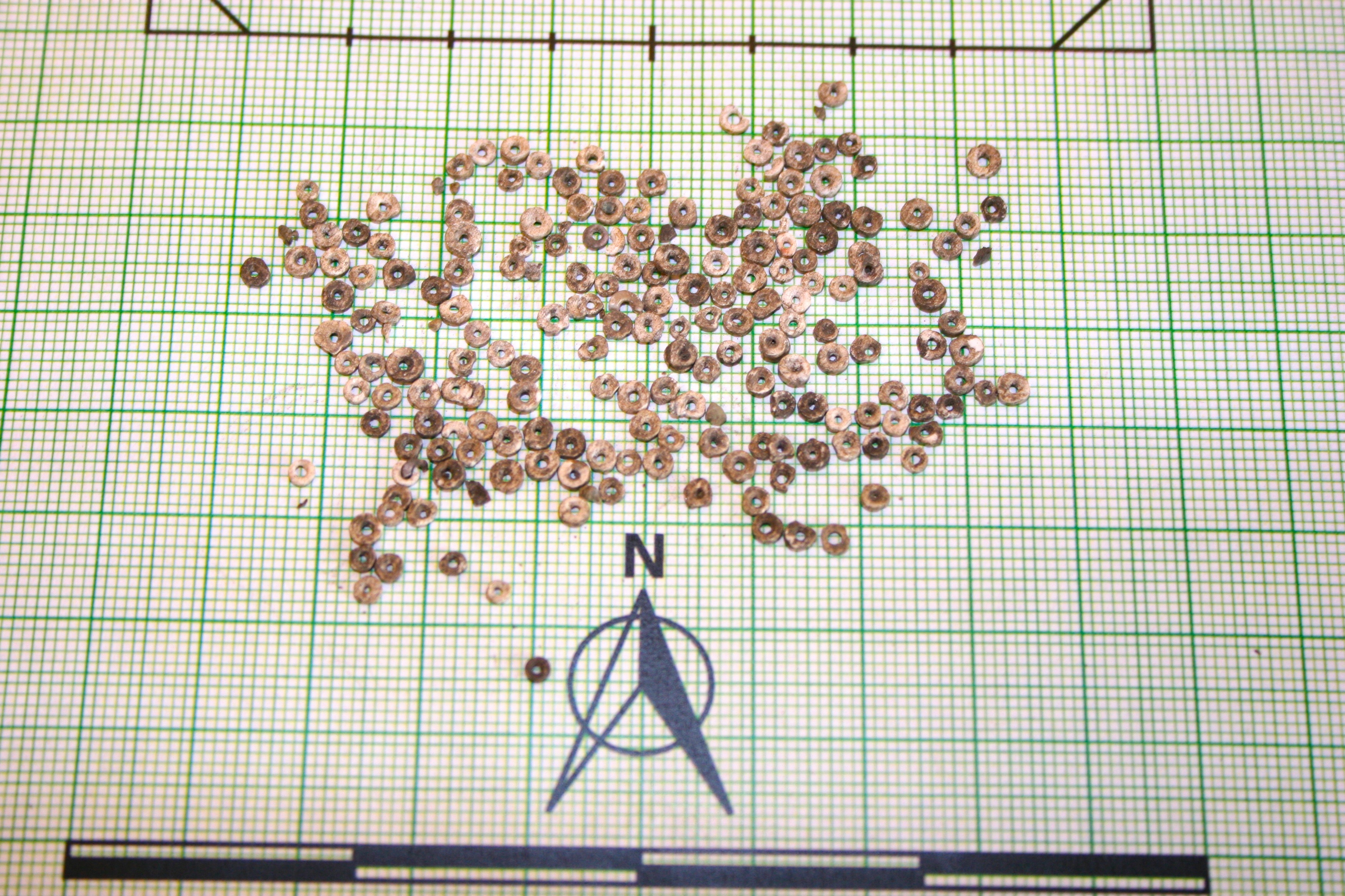 Shell beads from DjRw-14. Large grid is one centimetre, small is one millimetre.  Note the interior diameters of less than one millimetre.   Picture courtesy of Dr. Terry Clark, CMC. Click to enlarge.