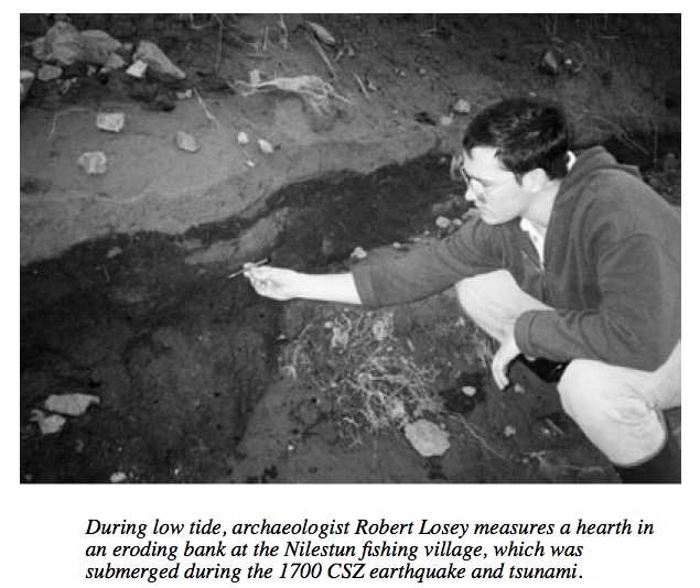 Every few centuries, on average, the Northwest Coast gets shocked by a massive mega-thrust earthquake, on the order of 8 to 9 on the Richter scale. On occasion, these produce a devastating tsunami wave. It wouldn’t be surprising then if such disruptive events featured in aboriginal oral histories and also in the archaeological record itself. There is a growing body of research on this topic which I am not planning on reviewing at this time, but a nicely focused starting point is a series of papers in the Oregon Historical Quarterly, available online.